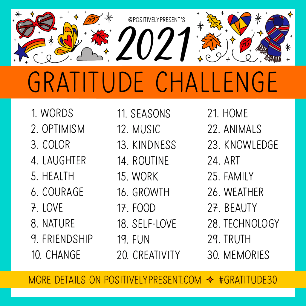 While perusing Facebook one day, I came across a post by Positively Present which was announcing the start of their annual Gratitude Challenge. It piqued my interest, so I went to the website to find out more. The goal of the “Challenge” is to focus on something to be thankful for every day. Blog author, Dani DiPirro, provides readers with a list of words to help spark the writers’/artists’ sense of appreciation and thankfulness. Since I have been in a writing slump, I thought this would be just the thing to get me writing again. Below are some thoughts inspired by DiPirro’s prompt list. I am still working on #6 and #9.